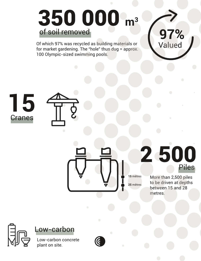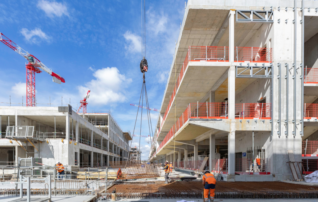 Insgesamt arbeiten fast 110 Personen an der Bauleitung dieser Baustelle, dazu kommen 575 Gesellen sowie etwa 100 Personen aus den Managementteams der Rohbauunternehmen (Vinci, NGE Bâtiment und das Konsortium Legendre-EGTPO-GCC). Auf dem Höhepunkt der Bauarbeiten werden mehr als 1.200 Mitarbeiter aller Gewerke an der Arbeit sein, um das neue Krankenhaus Anfang 2027 zu übergeben.