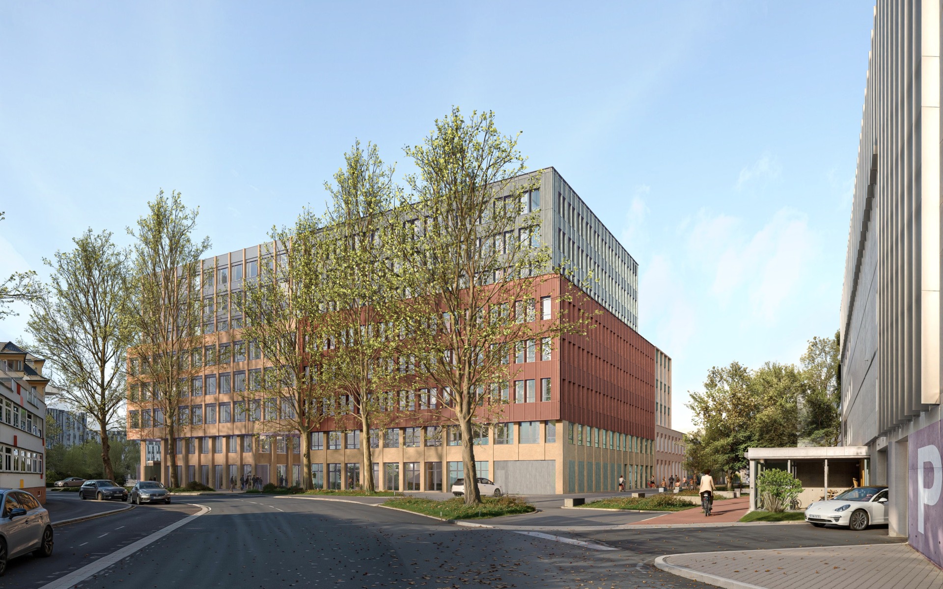 The building located at the North-East corner stands out as an architectural marker defining the intersection between Marie Hamm Street and Porte de l'Hôpital Street. This totem-like volume, both functional and emblematic, will embody the ambitions of the Eurometropolis and the health ecosystem. Its ground floor, widely open to the public space, will host an entrance hall highlighting the site’s accessible and innovative purpose.