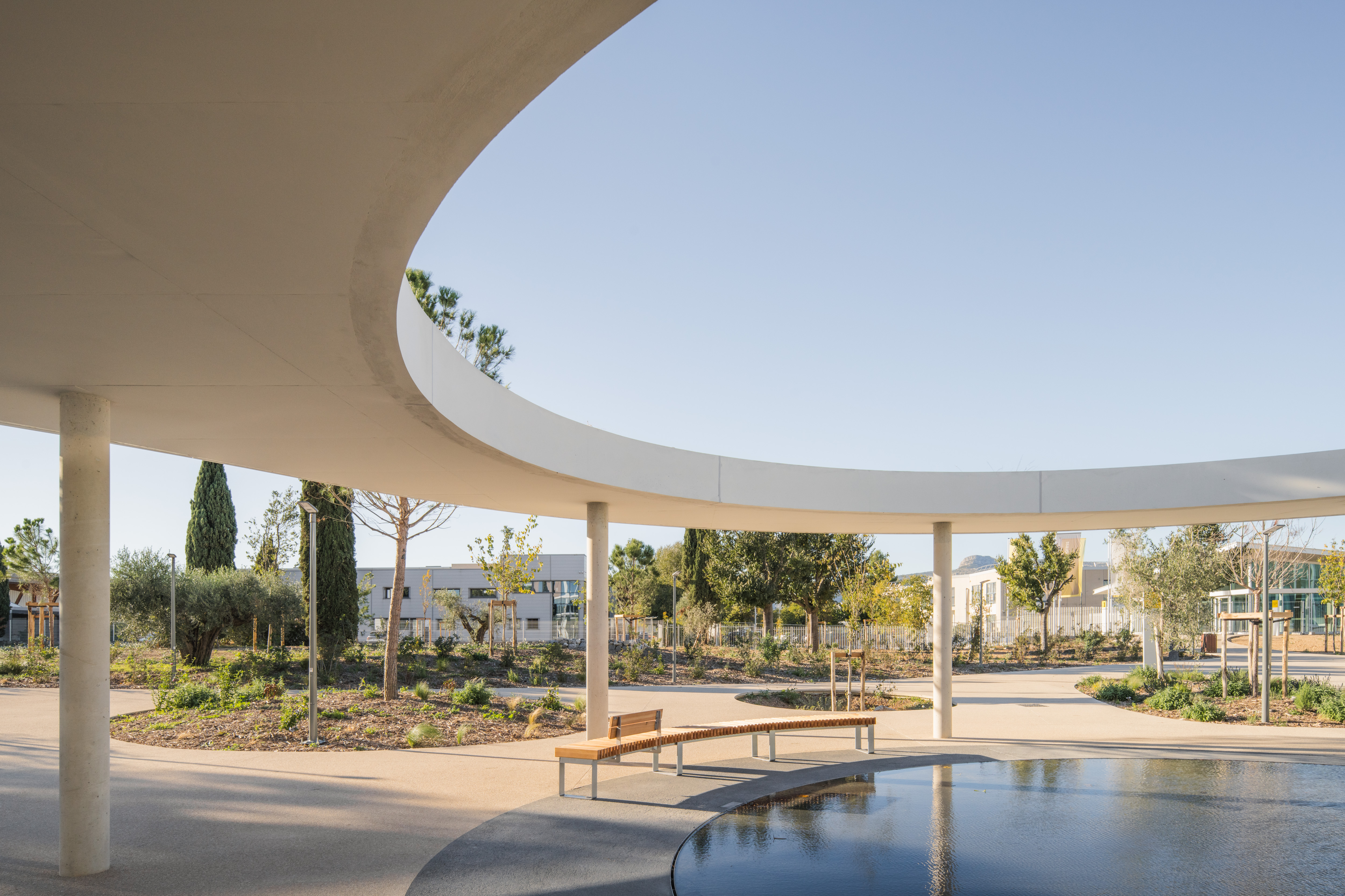 The vegetated canopy, located in the center of the campus, serves as a meeting and informal strolling space between the various buildings, while an elliptical water mirror reflects the site’s floodable nature. Furthermore, 100 trees, including many pines, are planted to enhance both the biodiversity and aesthetics of the campus. The vegetation echoes the garrigue and Mediterranean gardens, rich in scents and colors. This planting creates a pleasant environment while offering shaded and refreshing areas, in harmony with the local climate. Water management is also an integral part of the project.In fact, the water pathways (swales, basins, etc.) follow the main axis of the site.