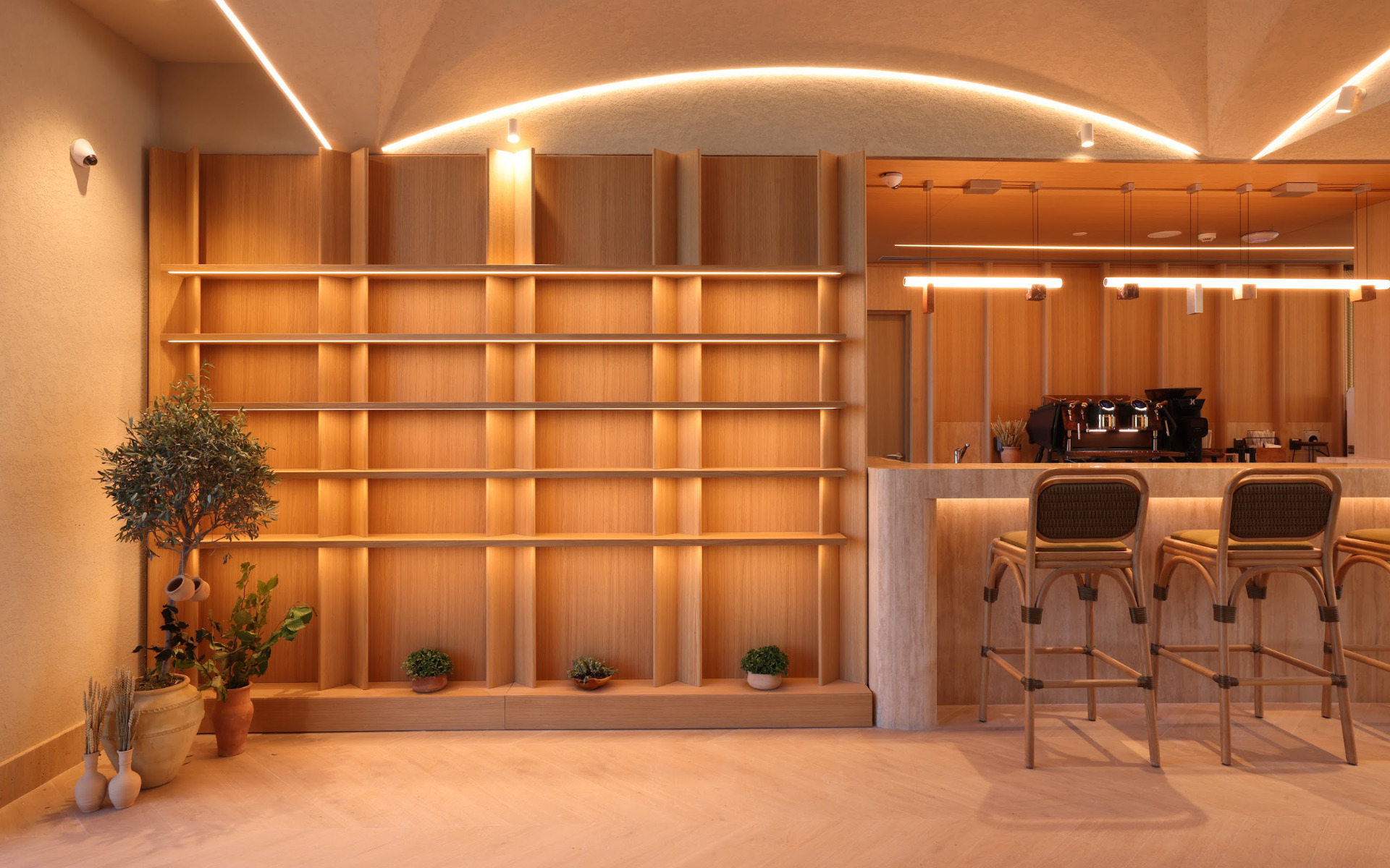 During the day, Knead Bakery comes to life as a vibrant and welcoming bakery. The display counter becomes the anchor point of the project. Made of travertine, it incorporates an Arabesque‑inspired motif designed specifically for Knead — a strong symbol of its identity and a nod to the local cultural context. The color palette, inspired by the world of baking, plays a key role in shaping the atmosphere. Terracotta, sand, and wheat tones create a soft and luminous environment, while wood hues evoke the crumb of bread, reinforcing a sensory link between material, use, and emotion.