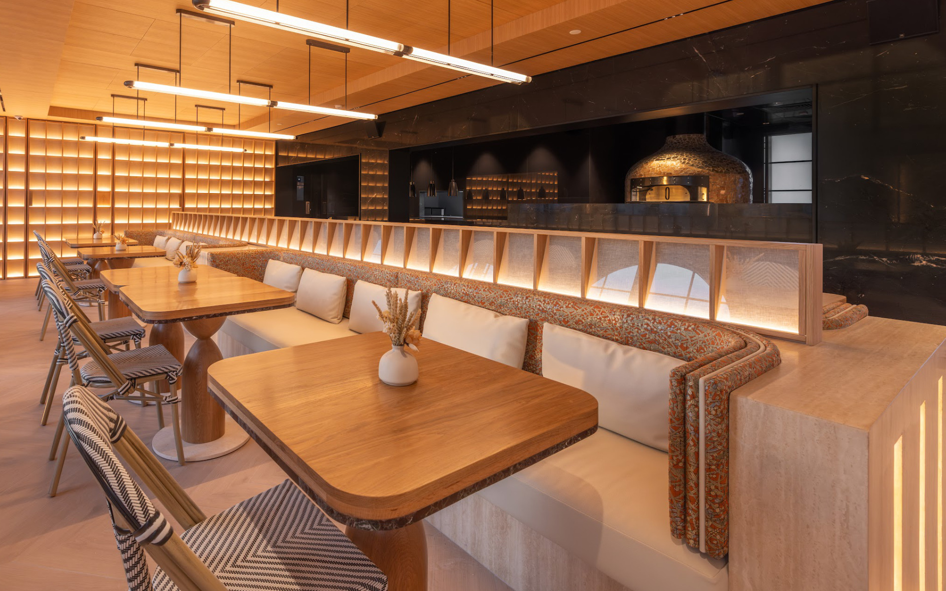 The back wall of the dining room was designed as a scenographic element in its own right. Composed of custom‑made wooden cubes, it uses the same wood species as the one featured at the head of the banquette. Inside certain modules, frosted panels installed at an angle, combined with integrated lighting, create a soft, rice‑paper‑like glow. This system also makes it possible to conceal technical equipment while maintaining discreet access through integrated solid panels.