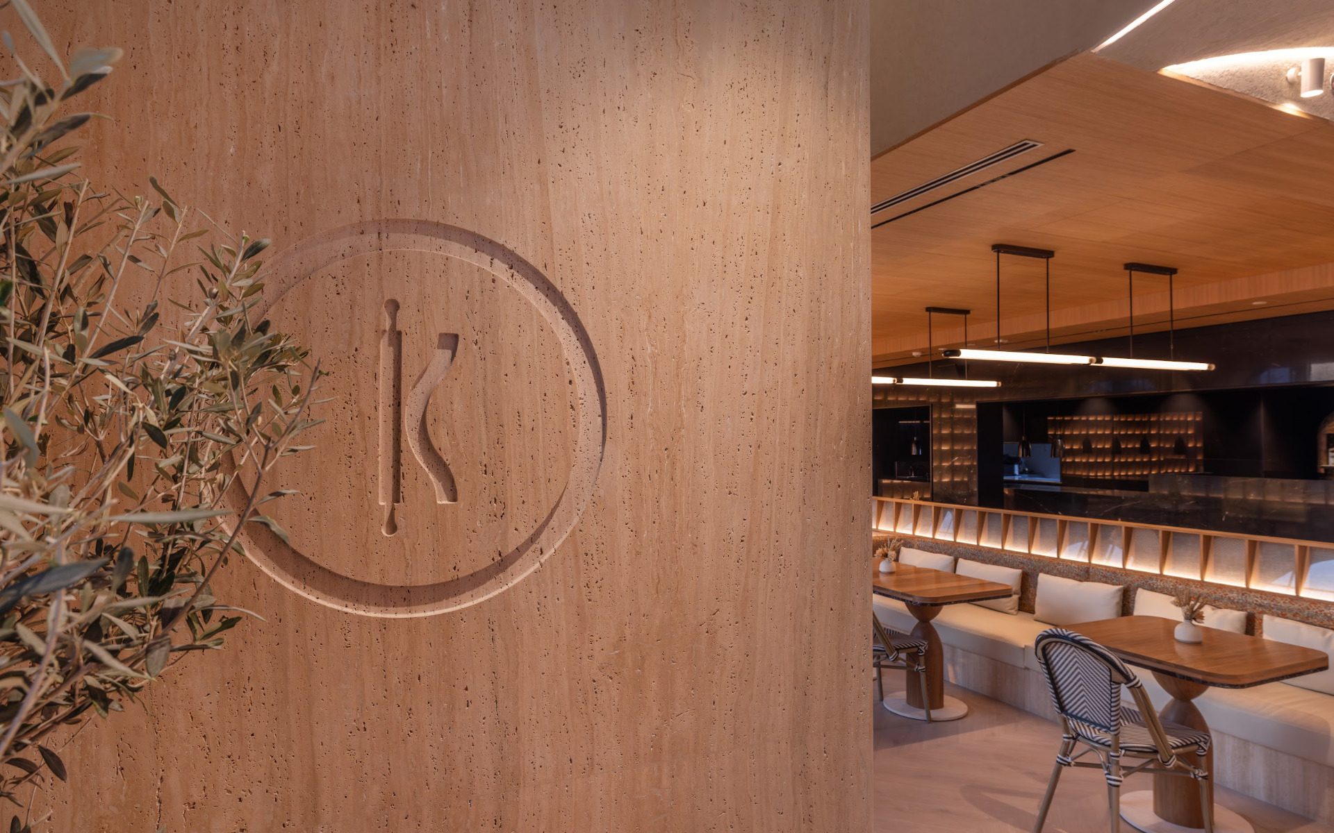 From the earliest design intentions, Knead Bakery was envisioned as a lively place, able to evolve throughout the day without ever losing its identity. The concept draws inspiration from the warmth of French bakeries, the generosity of Italian culinary tradition, and the Mediterranean character inherent to the site’s architecture. Added to these references is the equestrian world—ever-present yet treated with subtlety through curves, rhythms, and certain saddle‑making–inspired details, such as the use of leather, interpreted in an elegant and contemporary way.
