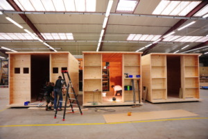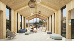 Le projet Maison de Rodolphe illustre cette approche constructive bois. Le projet repose sur une structure poteaux poutres en bois au sein de laquelle viennent s’insérer des caissons tridimensionnels de 15 m² en CLT. Ces modules, entièrement assemblés, équipés et meublés en usine, arrivent prêts à être installés. Leur conception modulaire permet non seulement une mise en œuvre très rapide, mais aussi la possibilité d’agrandir facilement les espaces en reliant plusieurs modules entre eux. Cette flexibilité offre une solution d’habitat évolutive, qualitative et parfaitement adaptée aux besoins des résidents.