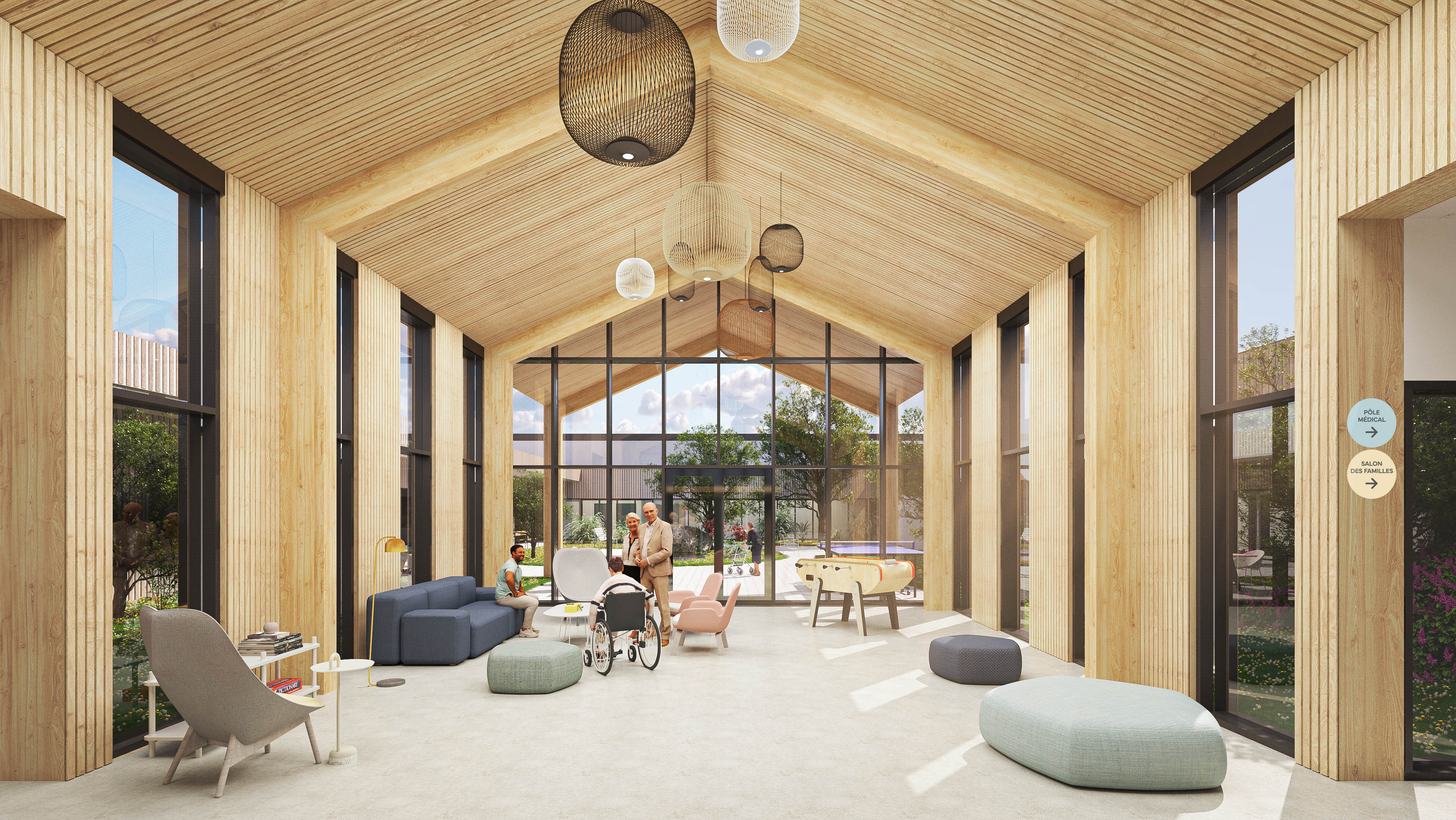Le bois offre un confort thermique et acoustique naturel. Sa structure cellulaire régule les variations de température. Sa texture et sa présence créent des ambiances chaleureuses, accueillantes, propices au bienêtre, à l’attention et à l’engagement. Dans la Maison d’Accueil Spécialisée à la Rochelle, la charpente bois structure les espaces de vie et contribue à une atmosphère calme et maîtrisée. Ses qualités thermiques et acoustiques participent à la stabilité du cadre intérieur, essentielle pour le confort quotidien des résidents. Le bois, présent dans les volumes principaux, apporte une matérialité simple et naturelle qui soutient la lisibilité des lieux.
