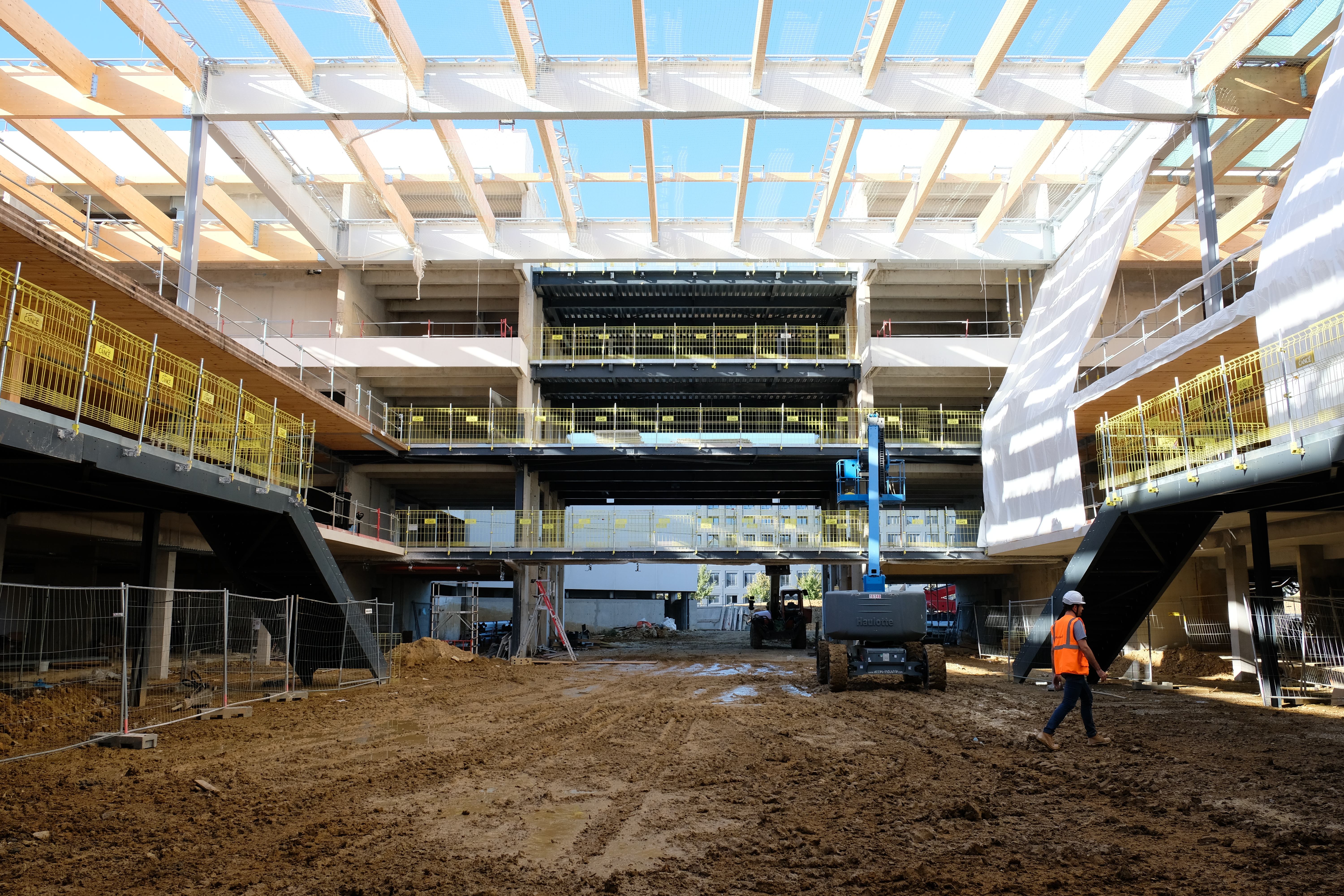 Dans la réhabilitation du bâtiment Breguet du campus Paris Saclay, le volume cœur joue un rôle structurant : sa nouvelle halle s’appuie sur une structure bois conçue pour créer de grandes portées. L’usage du lamellé-collé et du CLT permet de dégager un espace central généreux, propice aux circulations et aux usages multiples, sans surcharge visuelle. Le bois y affirme une présence constructive mesurée, au service de la clarté du volume et de la qualité d’usage.