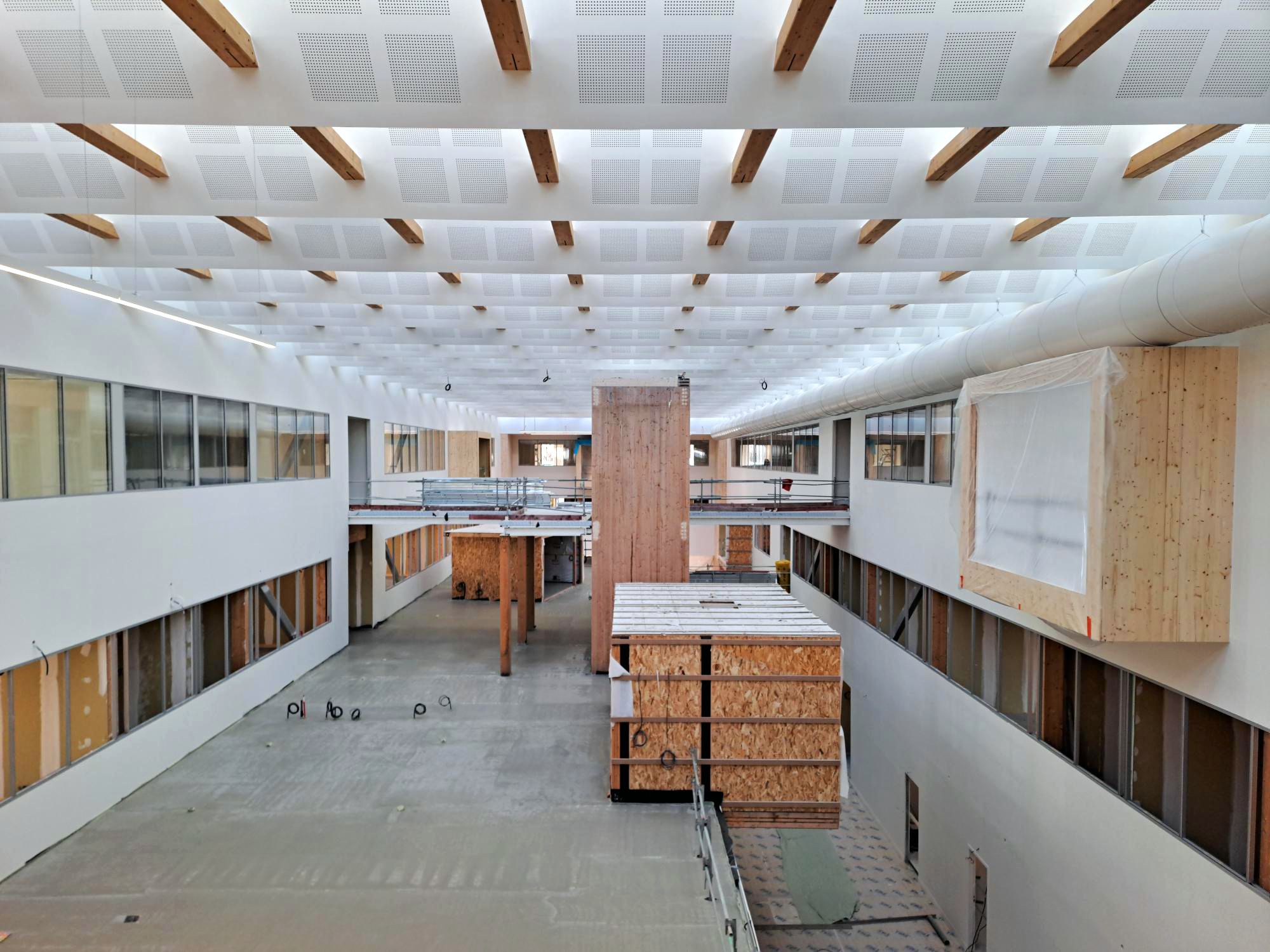 Dans le projet du groupe scolaire Lassagne, le bois constitue l’un des leviers principaux de la stratégie bas carbone. Employé en façades ossature bois, en bardages, en faux–plafonds en fibre de bois et pour les menuiseries intérieures. Il s’intègre aussi bien aux extensions neuves qu’aux bâtiments réhabilités. Ce choix accompagne une démarche globale : limitation des démolitions, valorisation de l’existant et réduction de l’impact carbone dès la phase chantier.