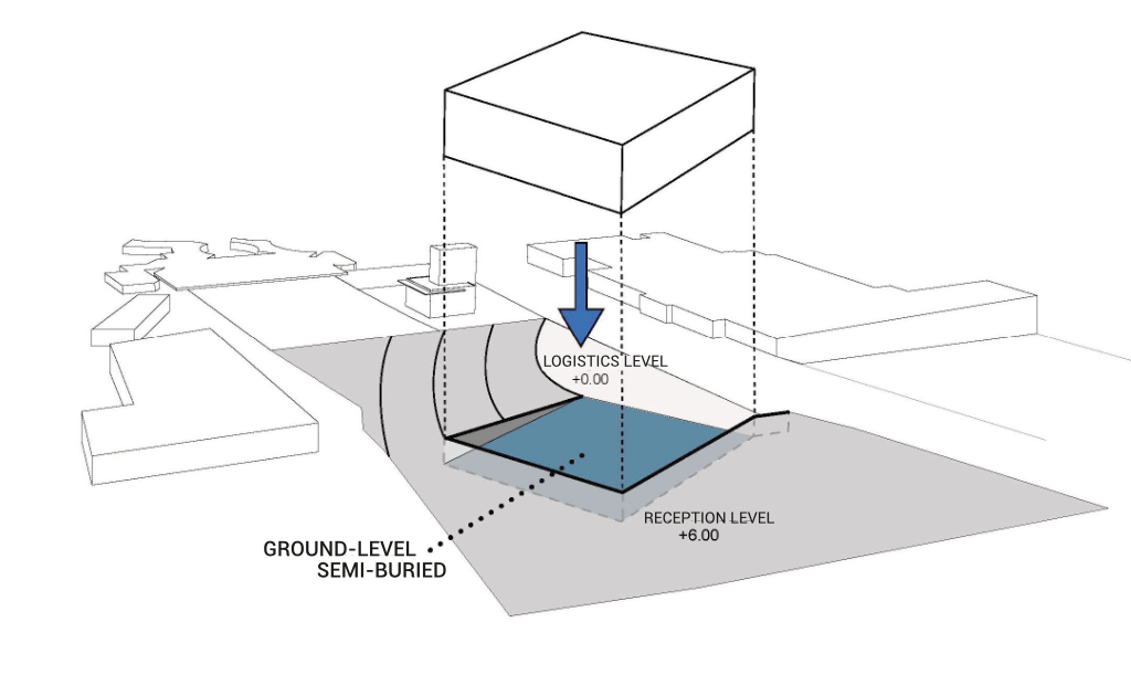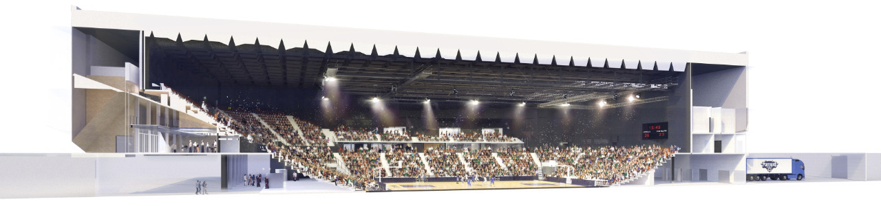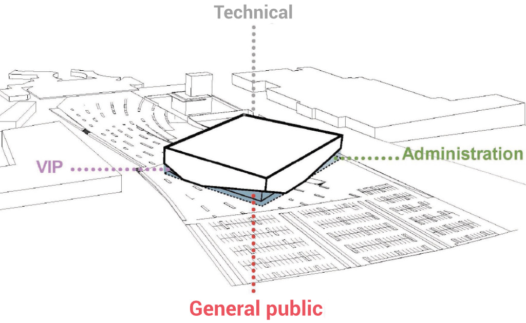 Le niveau bas du bâtiment, correspondant au parterre, sera accessible de plain-pied depuis l’aire de manoeuvre et de livraison des semi-remorques. Le parvis public et l’accès des spectateurs se feront à un niveau supérieur, de plain-pied également avec le terrain naturel sur le côté opposé de l’Aréna. De ce fait, la perception du volume est minimisée et ainsi mieux intégrée à son contexte, et la fonctionnalité est clairement renforcée. L’angle du bâtiment marque une figure de proue qui l’affirme comme un signal, un point de repère.
