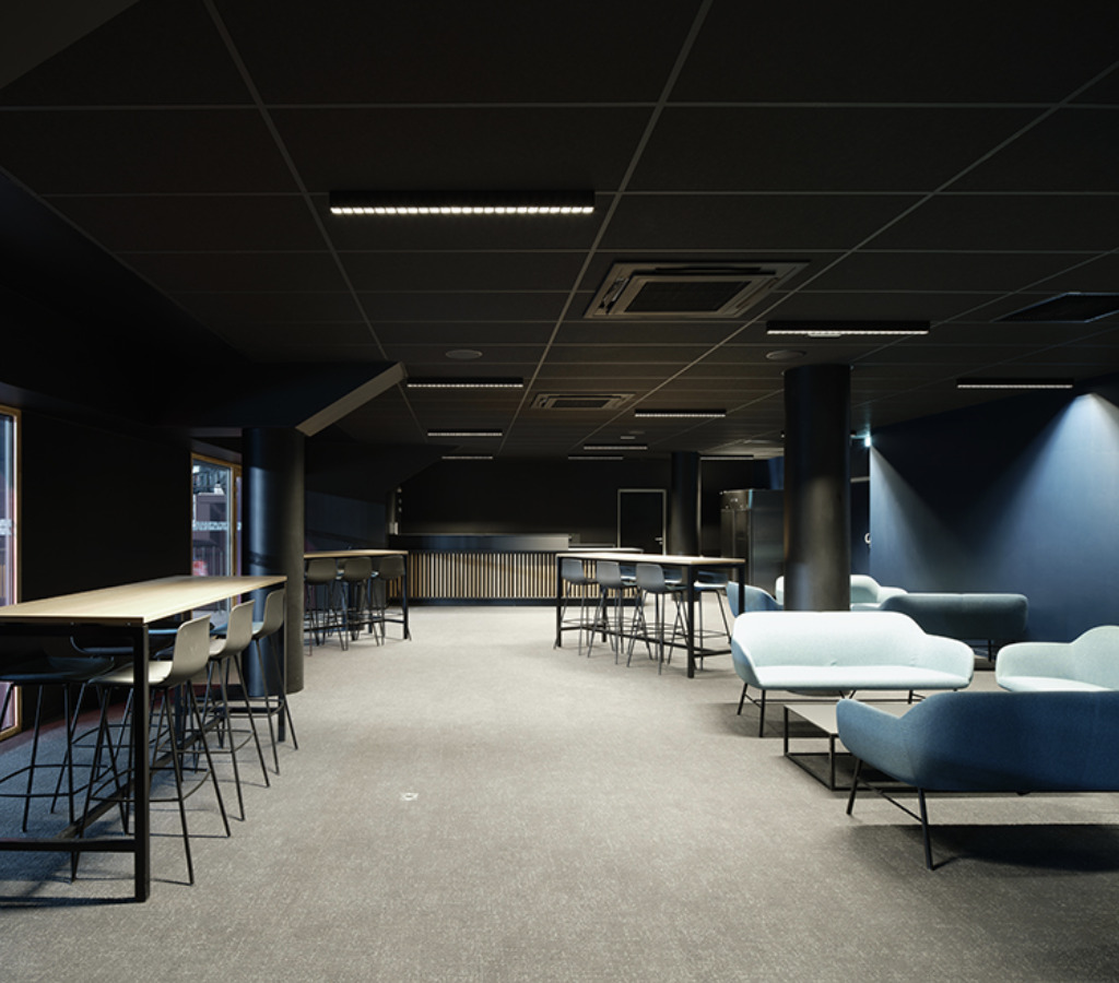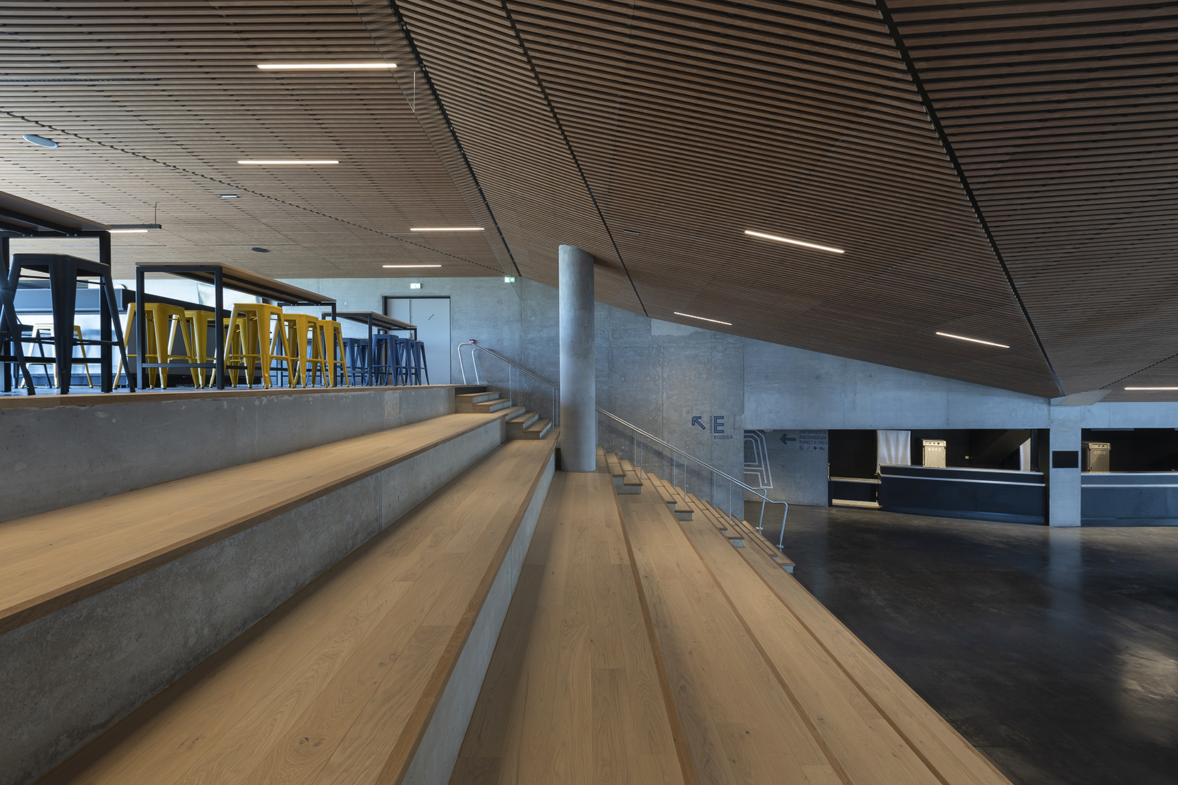 Les plafonds suivent la pente des gradins et sont habillés de bois dans la continuité des sous-faces bois à l’extérieur du bâtiment. Le déambulatoire donne accès aux nombreux sas d’entrée à la salle. Enfin, il est le point de départ de larges escaliers qui amènent le public au niveau parterre, ainsi qu’aux tribunes hautes.
