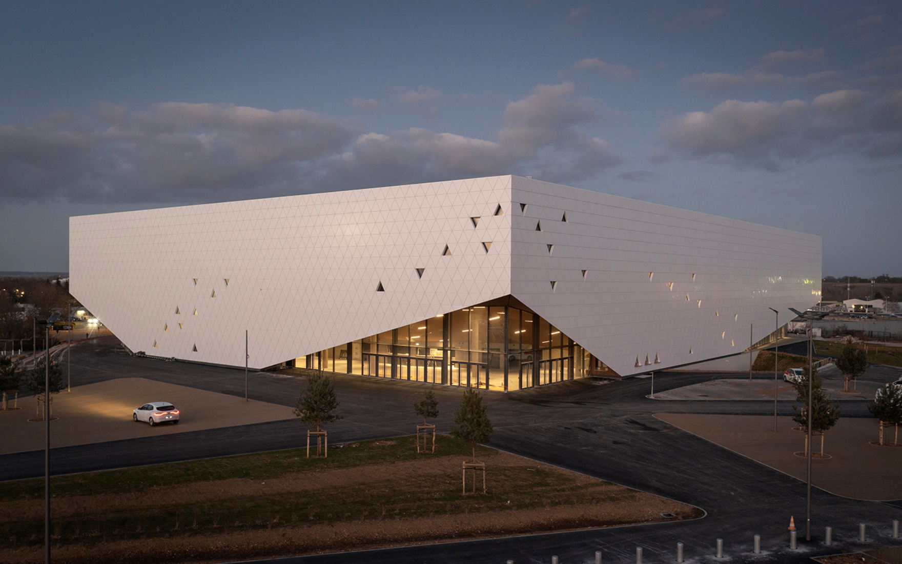 L’écriture architecturale, tant à l’intérieur qu’à l’extérieur, met le spectacle, qu’il soit sportif, culturel ou économique en avant. Nous avons choisi d’utiliser peu de matériaux. Les façades sont revêtues d’un bardage métallique en cassettes triangulaires en aluminium composite de teinte blanche, avec intégration de châssis vitrés triangulaires aux dimensions des facettes. Les sous-faces sont en bardage bois, protégées des intempéries, composées de lames fines ajourées.