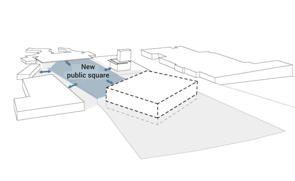 Le nouveau volume s’implante d’une manière telle qu’une place publique piétonne est créée. De ce fait, les différentes entités existantes et à venir gravitent autour d’elle et forment un tissu lisible et remarquable.
