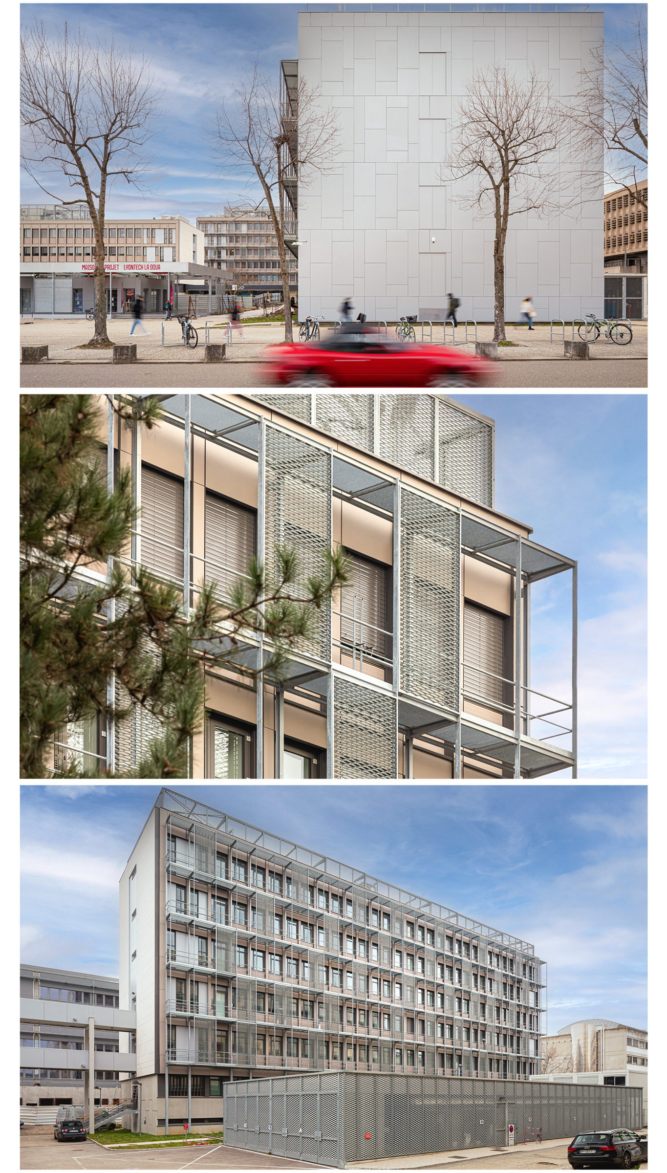 Les façade béton de l’UCBL sont réinterprétées par la mise en œuvre de modules et d’un parement minéral en fibre de ciment strié (écho au béton matricé), l’intégration de brise-soleil orientable et le travail sur l’isolation thermique, permettent d’offrir un niveau optimal de confort aux usagers. Une coursive métallique est créée afin de recevoir les bouteilles et réseaux gaz. Des panneaux de métal déployé permettent de masquer cette partie technique tout en conservant l’apport lumineux et servent également de brise-soleil. La disposition de ces panneaux en quinconce, amène un jeu aléatoire et dynamique sur la façade. Cette intervention ajoute une image contemporaine au bâtiment, en maintenant la lecture de la façade historique.