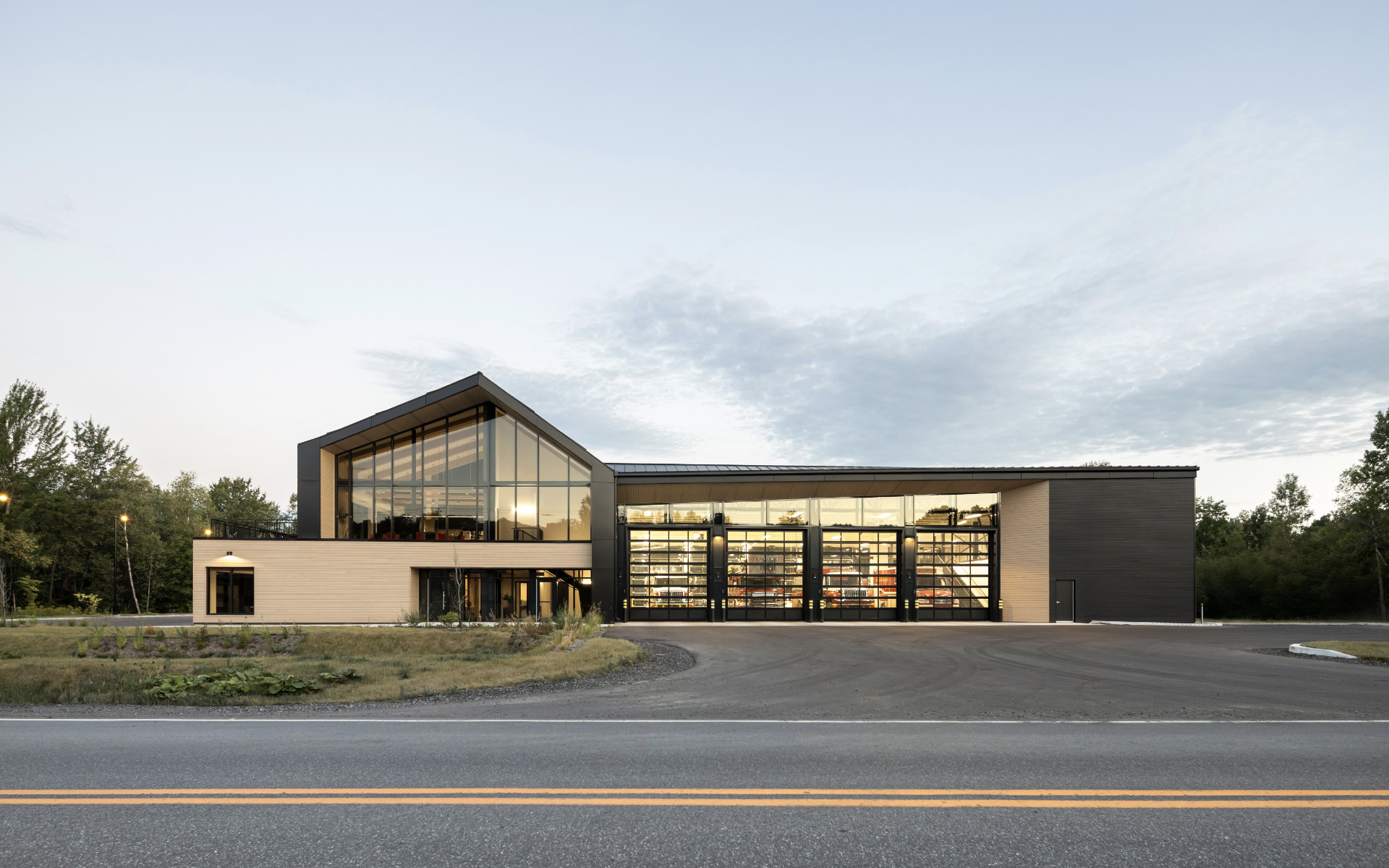 L’architecture s’inscrit dans un dialogue harmonieux avec le paysage champêtre et bâti de Bromont. Inspiré des silhouettes familières des granges et maisons rurales, le volume à deux versants en bois massif apparent abrite les espaces de vie des pompiers : dortoirs, vestiaires, cuisine et salle de repos. Ce geste architectural évoque l’héritage vernaculaire tout en affirmant une modernité sobre et assumée. En contraste, le garage vitré traversant, articulé autour de neuf portes, adopte un langage plus contemporain et fonctionnel, pour une efficacité opérationnelle optimale.
