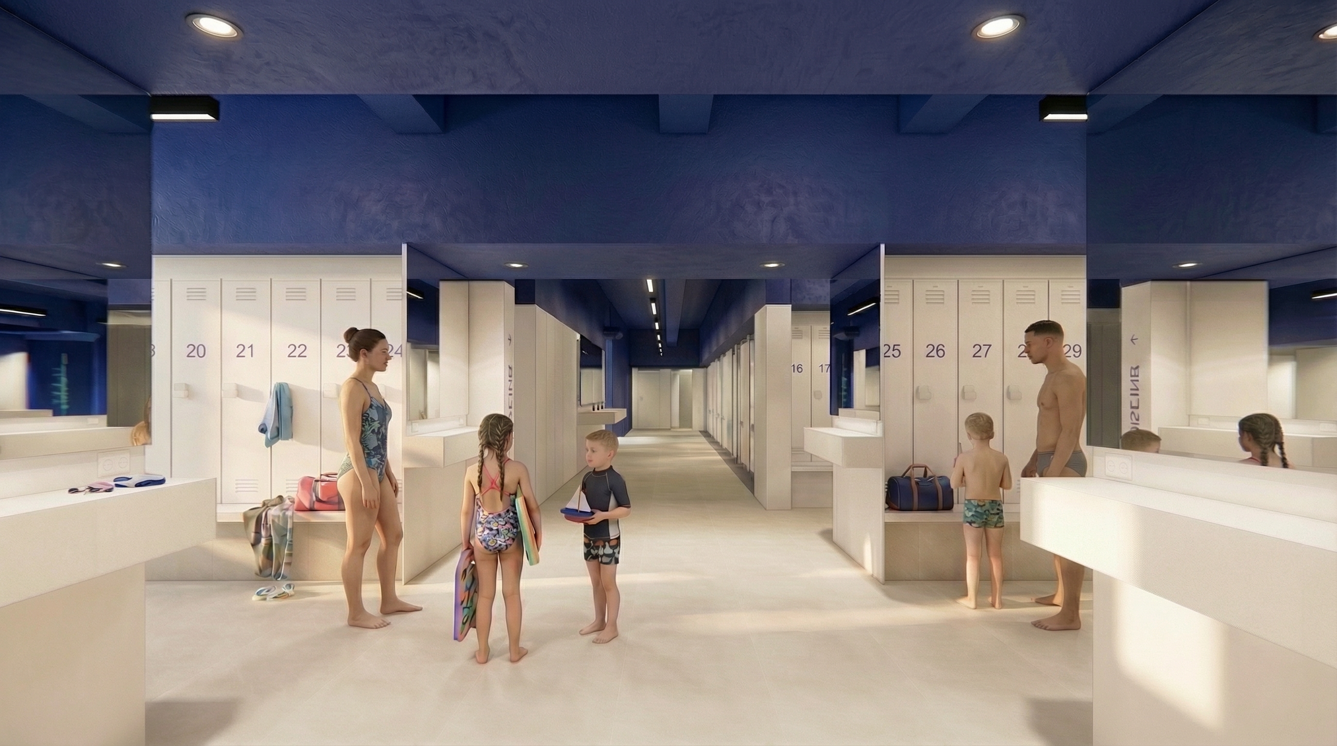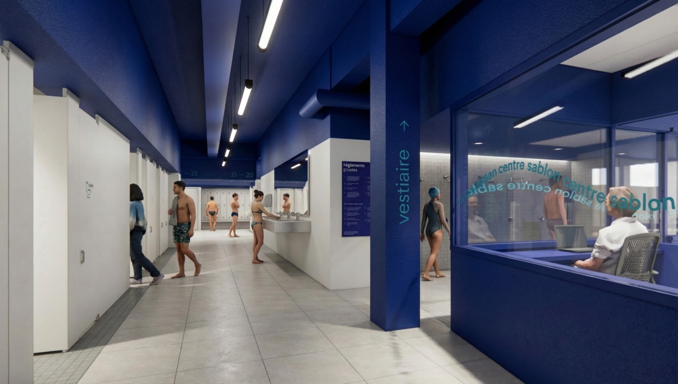 Le bleu signature du Centre Sablon, couleur identitaire du lieu, ponctue la piscine, les vestiaires et le plafond. Il dynamise les espaces et offre des repères visuels doux et rassurants. La signalétique et les parcours fluides contribuent à rendre l’expérience plus conviviale pour tous.