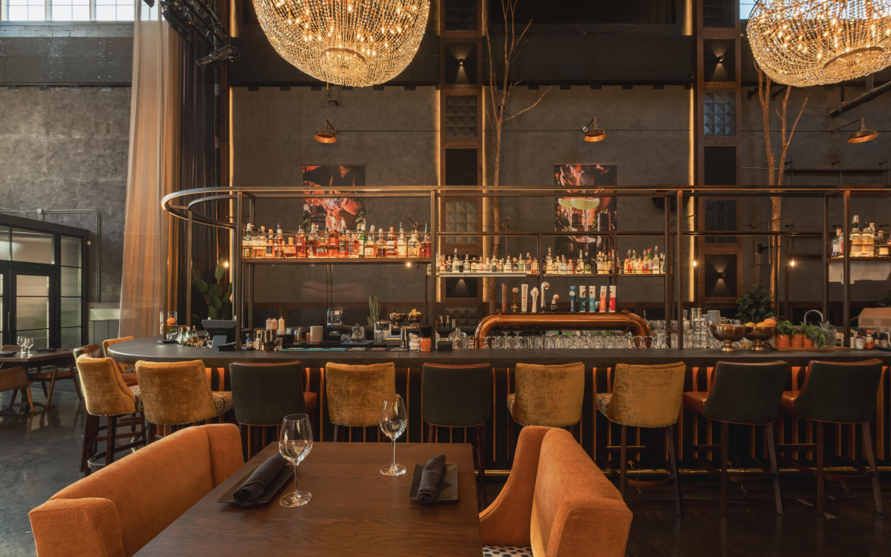 L’esthétique de l’Arsenal & Co. fusionne habilement le passé et le présent, en intégrant des matériaux bruts comme l’acier, le bois et le béton, ainsi que des éléments plus raffinés tels que le cuivre et le velours. Chaque détail, du mobilier aux luminaires, contribue à créer une ambiance riche et enveloppante. Les imposants lustres, atteignant jusqu’à 2,9 mètres, véritables pièces maîtresses suspendues au-dessus de la zone du bar, attirent instantanément le regard dès l’entrée, ajoutant une touche de grandeur à l’ensemble de l’espace.