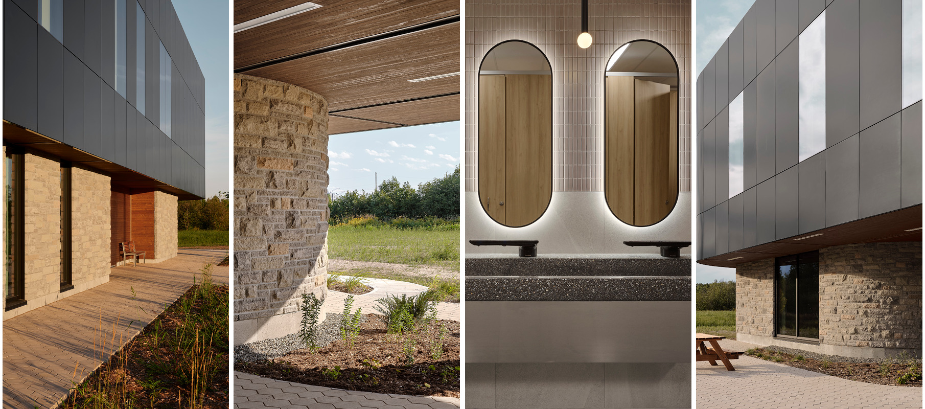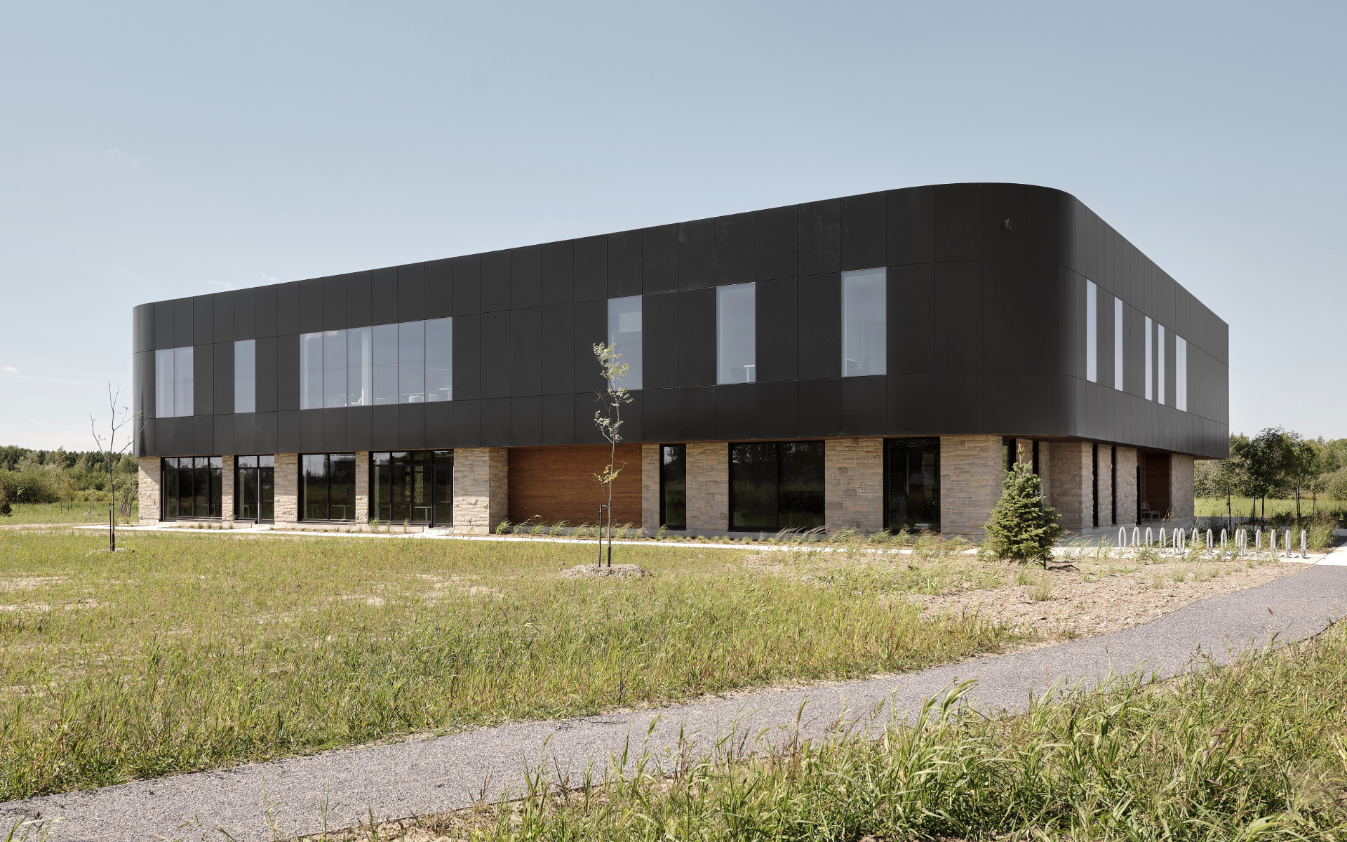 Implanté en périphérie du centre-ville de Bromont, sur un terrain offrant des vues dégagées sur le mont Brome, le bâtiment adopte une posture d’écoute plutôt que de domination. Le projet s’installe sur une portion du site auparavant peu végétalisée et regénère l’espace par une requalification paysagère d’envergure, marquée par la plantation de plus de 3 000 végétaux, incluant environ 65 arbres, plus de 330 arbustes et près de 2 700 vivaces et graminées.