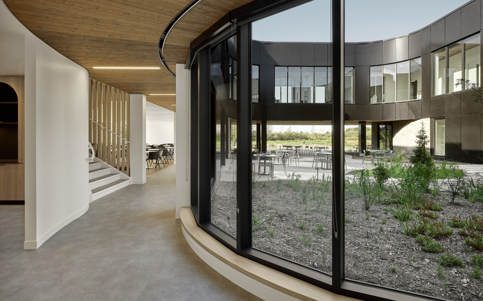 Un étang aménagé à proximité structure les abords et agit à la fois comme infrastructure environnementale pour la gestion des eaux pluviales et comme lieu de rassemblement. Conçu comme un parcours sensoriel, il invite les usagers à se déplacer lors de leurs pause, grâce à des cheminements, des ponceaux, des bancs et une diversité végétale soigneusement sélectionnée. Cet aménagement prolonge naturellement les usages vers l’extérieur et inscrit le quotidien des usagers dans un dialogue constant avec le paysage.