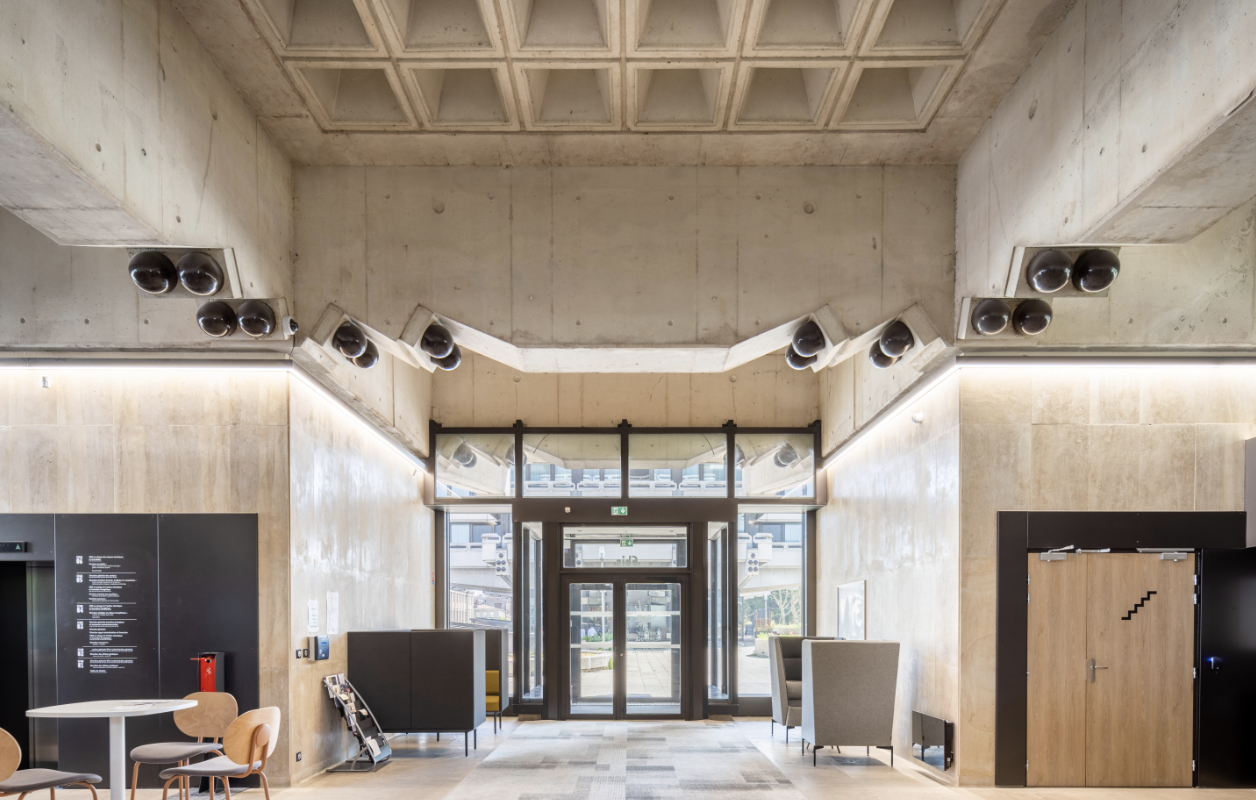 L’atrium distribue l’ensemble des activités de l’Ecole par des coursives transparentes qui reflètent les interactions et les échanges de cette communauté. Sa dimension généreuse accueille l’ensemble des élèves et la tenue de grandes manifestations.