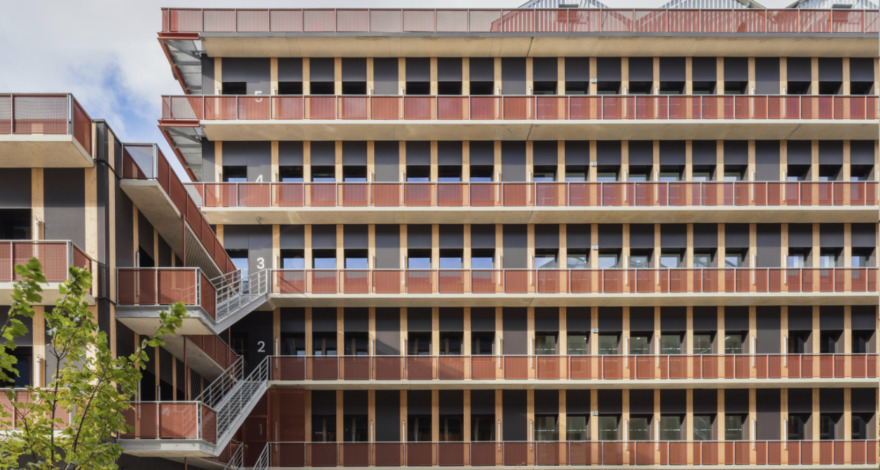 La conception bioclimatique a été pensée dès le plan masse, avec une morphologie du bâtiment incluant des terrasses protégées par des porte-à-faux, mais aussi l'aménagement extérieur avec la désimperméabilisation du sol stérile existant pour former des mails et parkings largement végétalisés avec des arbres ombrageant les façades l'été.